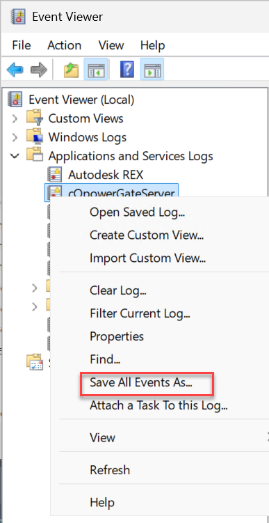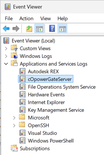 or by opening the Event Viewer directly and then navigating to "Applications and Services Logs" and then "cOpowerGateServer":