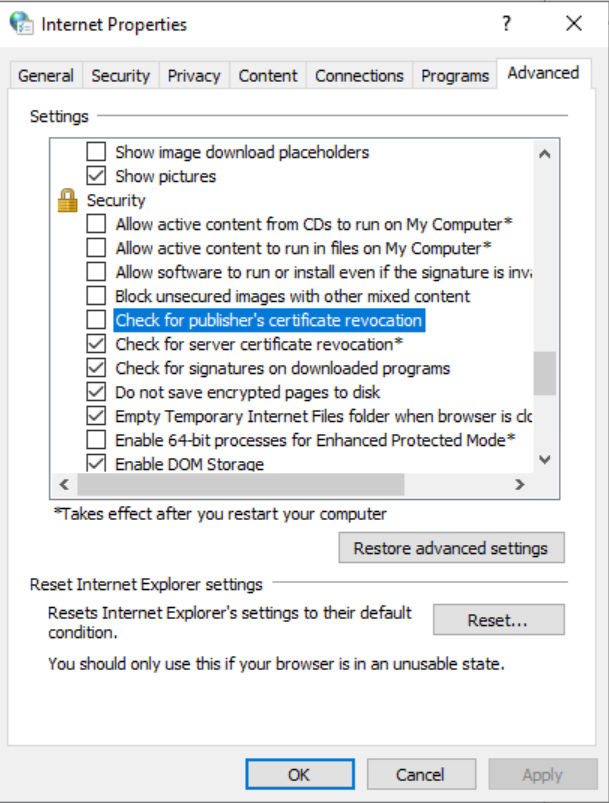 If the certificates are valid the issue is probably caused by certificate revocation checks. Open the Internet Properties -> Advanced tab. Make sure "Check for publisher's certificate revocation" is unchecked.